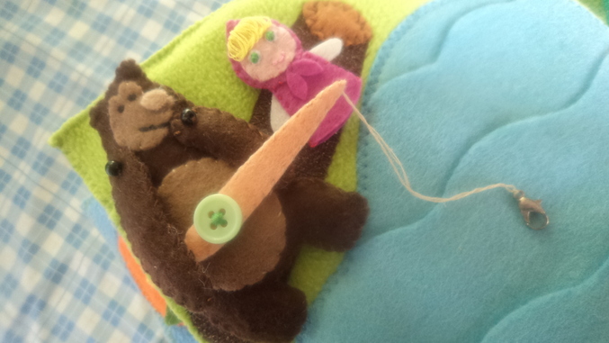 у медведя удочка,можно прикрепить к лапам,на конце удочки карабинчик(можно прицепить рыбку)