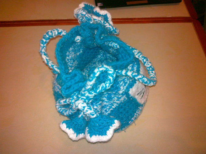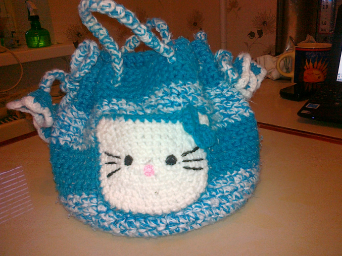 Видно,что она застиранная,но форму еще держит))))В основании блин,потом вязалась вертикально.Внизу есть еще обвязка,чтоб стояла,но на фото не видно.Шнур вязала хитро и уже не помню как.