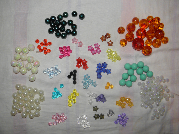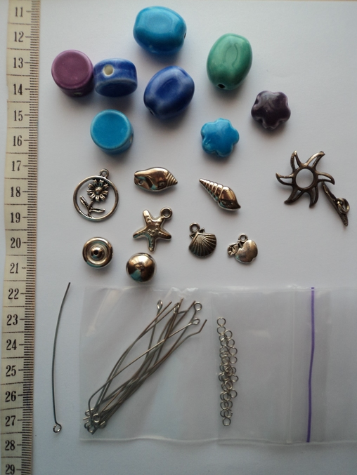 Описание: фурнитура для бижутерии. Бусины стеклянно-керамические, металлические подвески и застежка, штифты с петелькой длиной 6 см (10шт.), соединительные колечки (20 шт.)