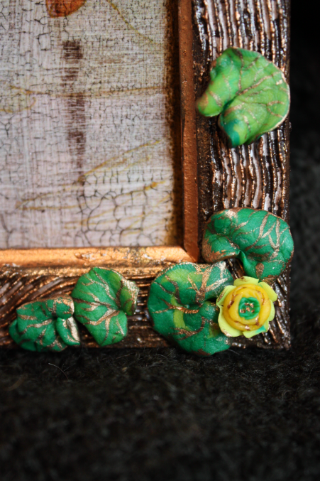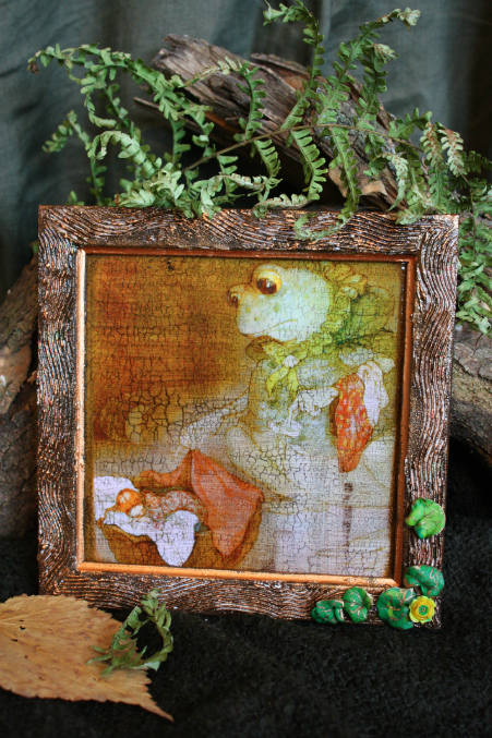 Техника: работа с распечаткой, 2х шаговый кракелюр; на рамке: работа по имитации структурной поверхности, рельеф лепленый «Кувшинки»