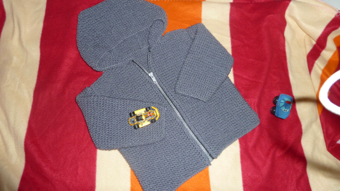 Моя вторая вещь крупная вещь на маленького человечка). Спицами не очень у меня получается вязать, но очень нравится платочная вязка. Вот и связала наконец сынуле кофточку.