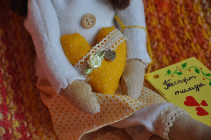 Материалы: тонированный хлопок, синтепух, флис, хлопок, винтажное кружево, атласные мини-розочки, пластиковые бусины, шерсть, хб нитки, трикотаж, металлическая подвеска, акриловые краски, румяна. Прилагается рукодельный паспорт куколки))