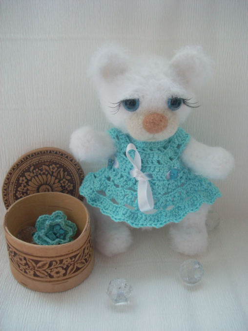 Симпатяшка! Голубые глазки, платьице, сама белоснежная...великолепное сочетание получилось! Катюша, ручки у тебя золотые, такую красоту творишь)))