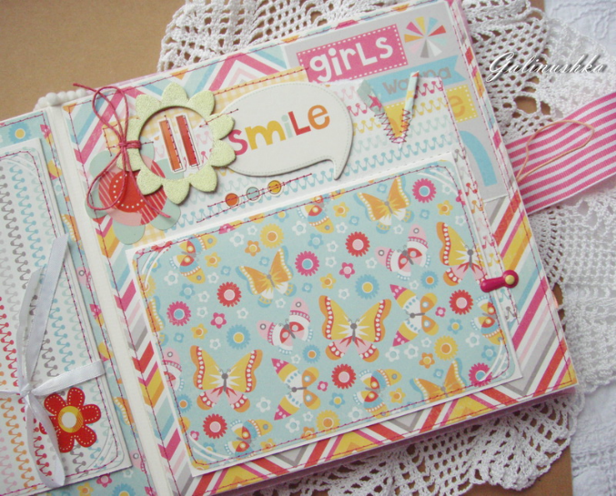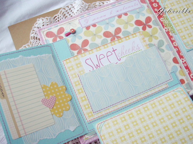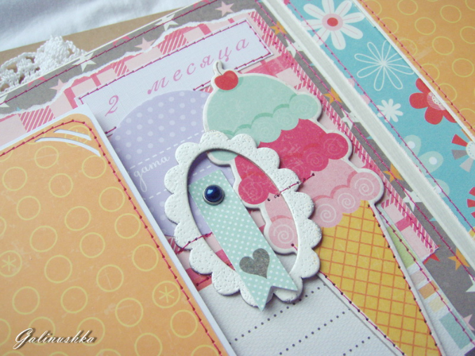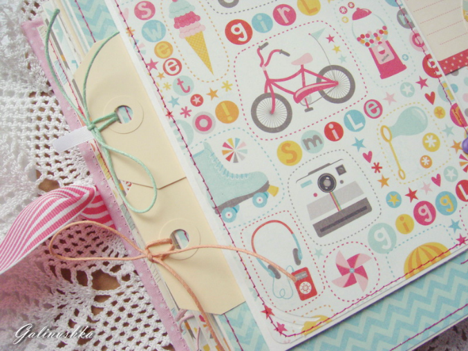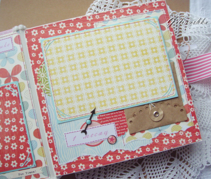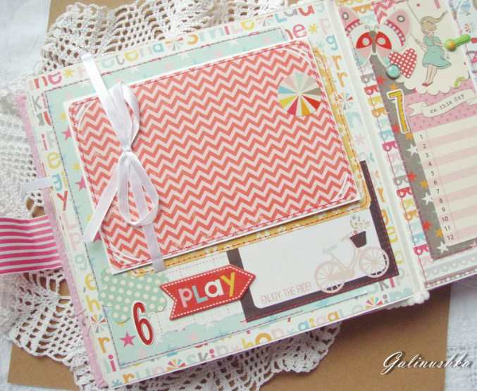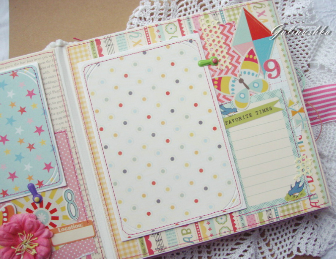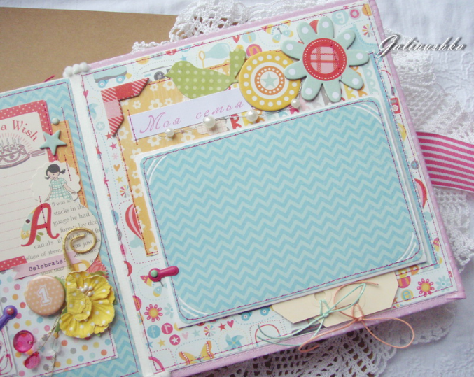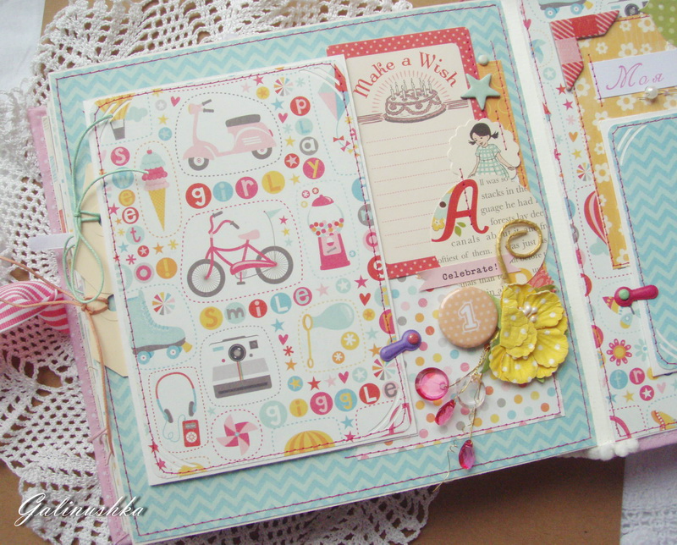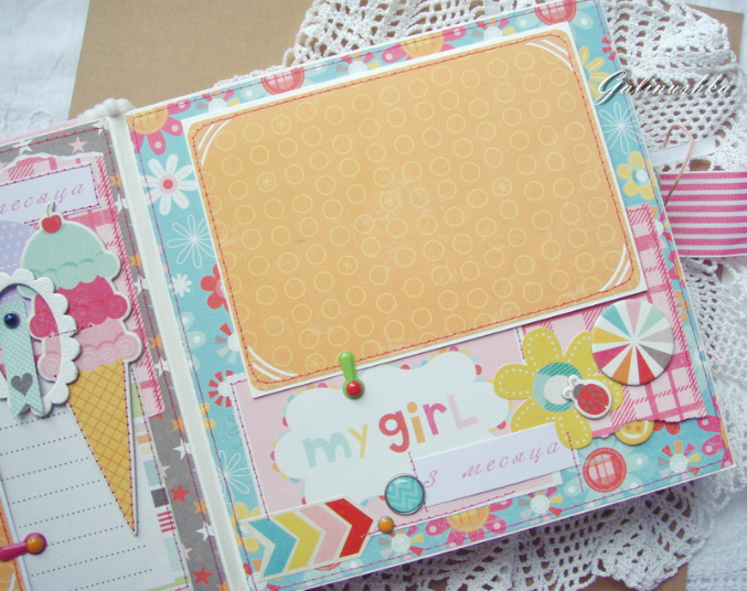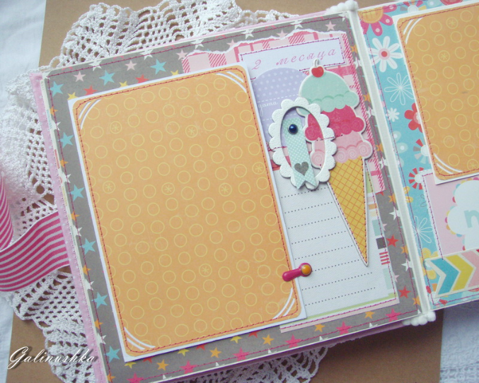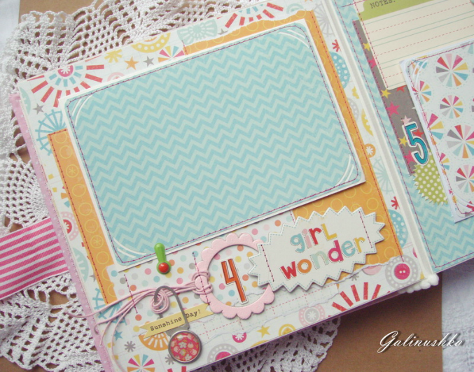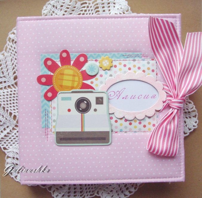 СкрапбукингЯркий, позитивный альбом про первый год жизни малышки Алисии) Формат альбома 21 на 21 см (странички 20*20 см), 14 страниц (7 разворотов), ручной переплет, мягкая обложка) Альбом тематический - от рождения до годика). Вместил в себя около 45 фото стандартного размера 10*15 см)