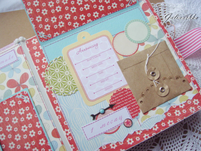 Вторая страничка про первый месяц с конвертиком для бирочки из роддома)