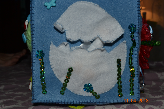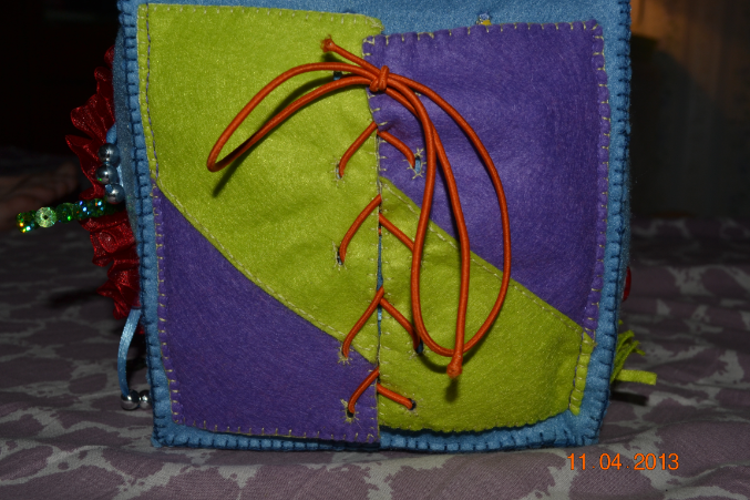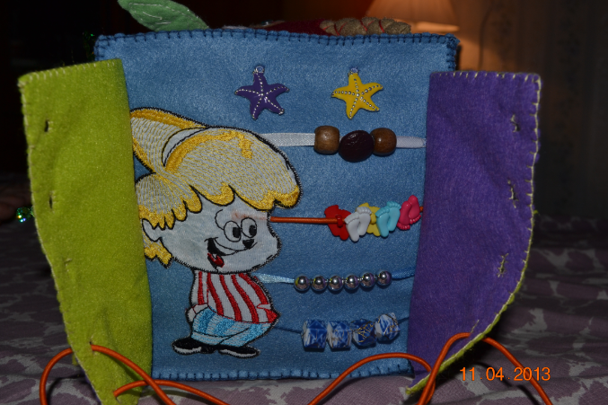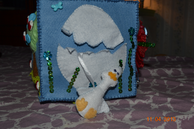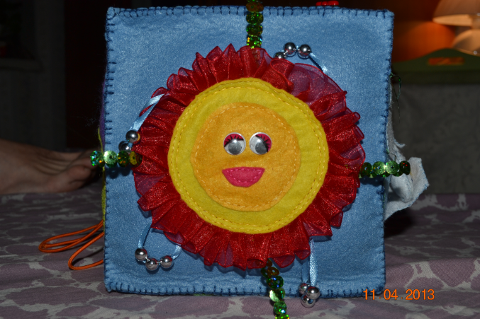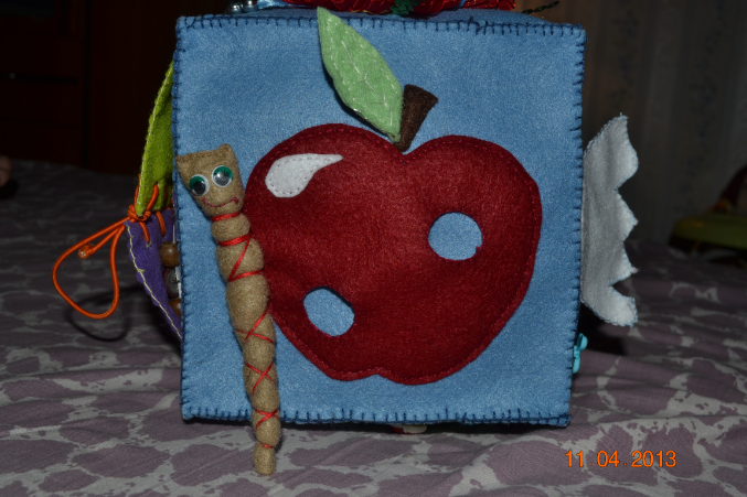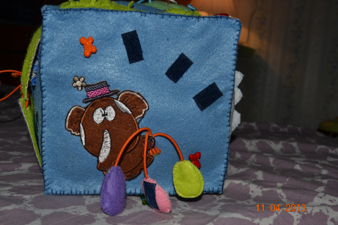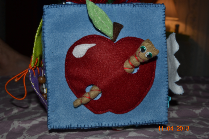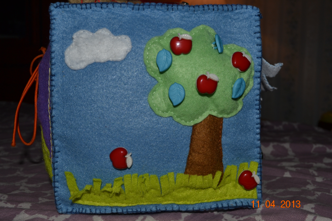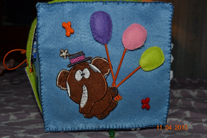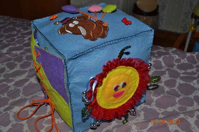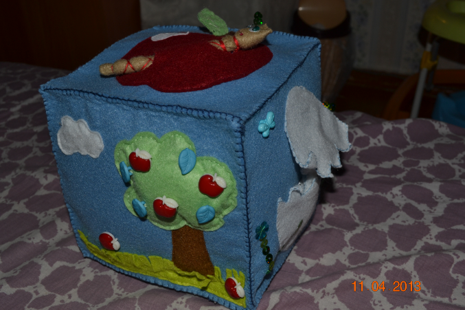 Фетрсшился за 4 дня кубик для сына!внутрь него засунула погремушки так что он звенит,набит синтепоном!все вручную сшито!3 идеи для граней взяты с интернета и видоизменены,а 3 идейки придумала сама!а вот и кубик!