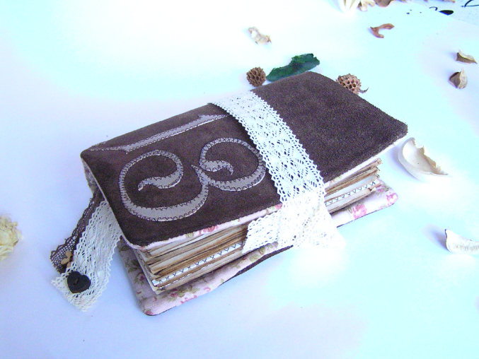 СкрапбукингЕщё один заказик ) Софтбук выполнен по мотивам одной из моих работ, только, по желанию заказчика, на обложку добавлено число "13". Внешняя сторона обложки – замша высочайшего качества (производство Италия). Внутренняя сторона обложки - ткань хлопок/лен. Листы искусственно состарены, тонированы, ароматизированы кофе с корицей. Края листов дополнительно тонированы огнем. Книга частично проштампована. Содержит две закладки из хлопкового кружева декорированные деревянными пуговками. Книга разделена на несколько частей листами крафт бумаги. Имеет два кармашка из плотной бумаги, листы с кармашками прошиты, тонированы чернилами. Блок собран и переплетен вручную. Закрывается на ленту из хлопкового кружева. Формат А6.