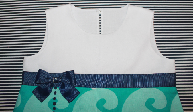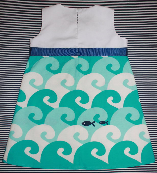 Сзади застегивается на петельку воздушную, не знаю правильно-ли назвала, очень мне понравилось их делать из косой бейки, раньше использовала резинку для петелек, она часто растягивалась, зато теперь и надежно, и красиво. Ну и из-за нехватки ткани - такой вот есть нюансик - рыбки совсем некстати в районе попы
