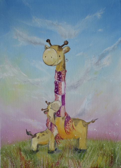 Спасибо, Марина! Нууу как сама)) - я вот в посте написала " Идея взята с открытки, автора, к сожалению, не знаю.." Там были жирафики на белом фоне, а я уже их решила сделать на опушке на рассвете в розово-пурпурном шарфике в горошек и сердечко :)