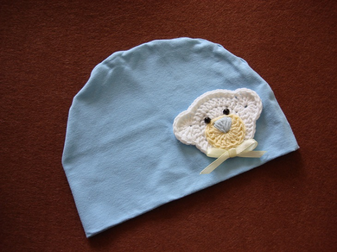 Продаю свою работу, шапочка сшита из хлопка на весну/лето с вязаной крючком аппликацией "мишка". Делала для сына прошлой весной еще, но одев пару раз на улицу мне показалось, что все-таки девичья шапочка получилась. Размер 42-44р.