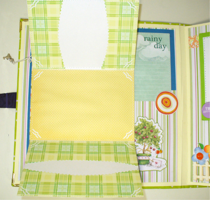 Часть странички откидывается, а тм место для трёх фото и небольшой блокнотик для записей.