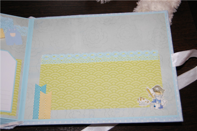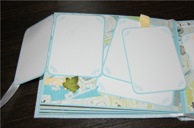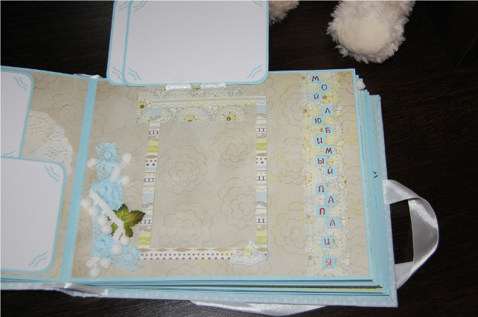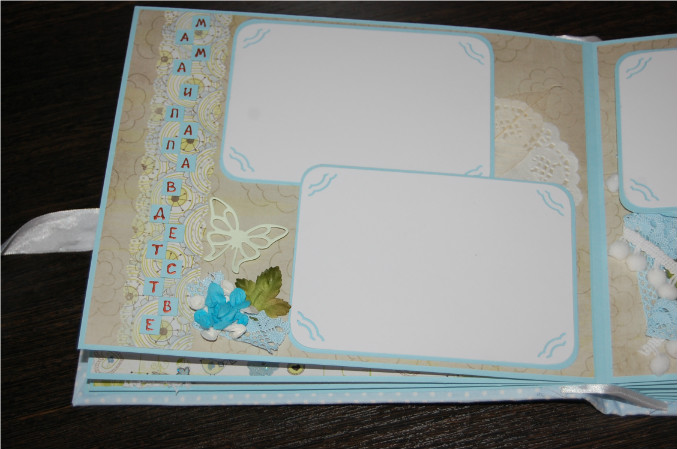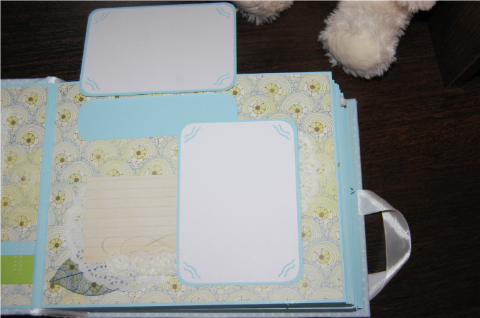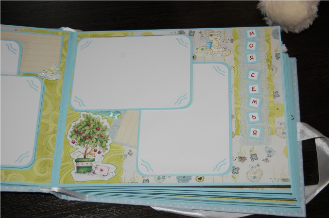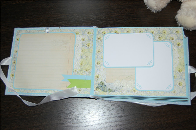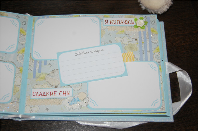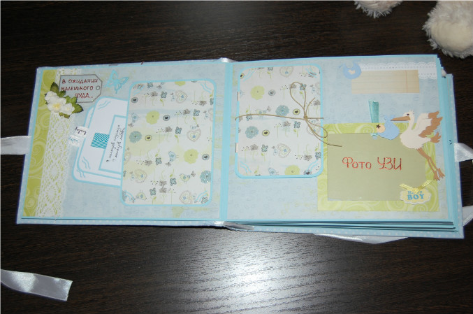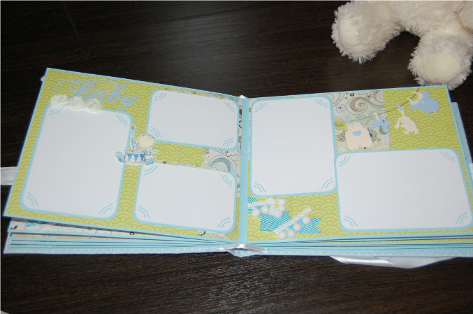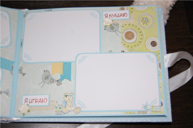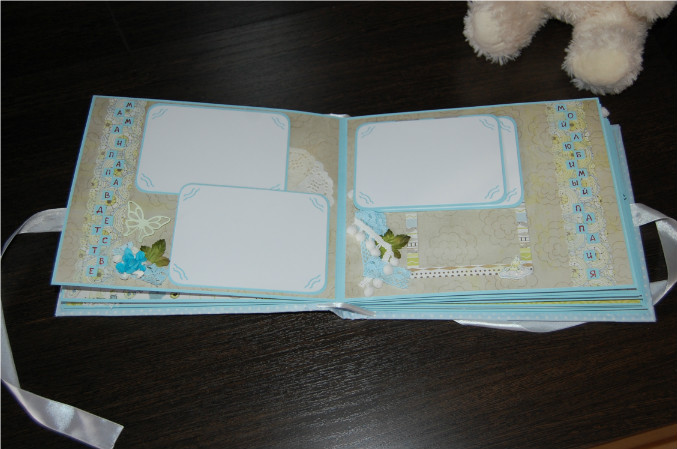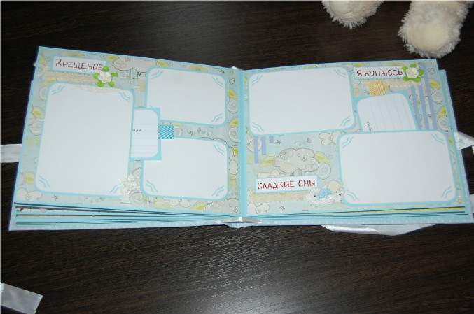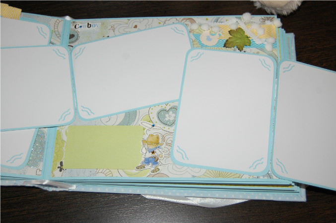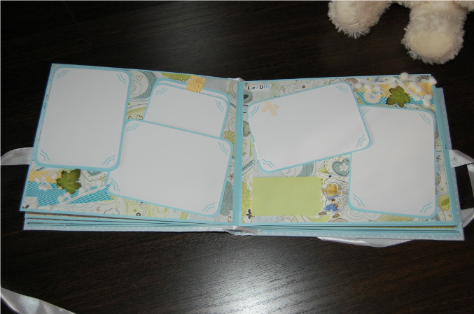 Ну так вот.. Альбом формата 22х27 см (обложка) и 20х25 см (сами страницы). Мягкая обложка из очень нежной ткани в горошек! книжный переплет! Обложка украшена тканью другого цвета, бумагой из набора, написано имя малыша! Внутри 11 разворотов, 22 страницы на голубой подложке. Альбом вмещает 67 фотографий (в основном формата 9х13):