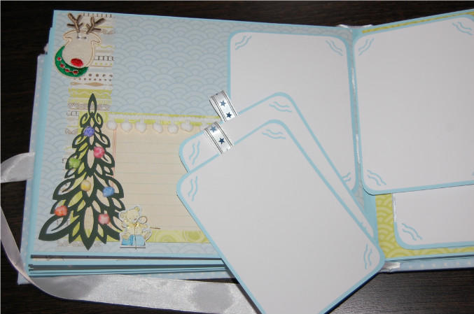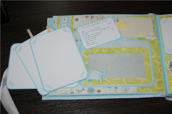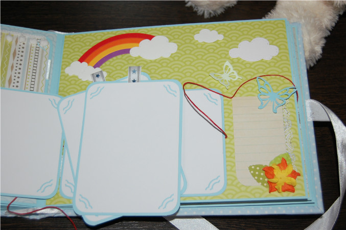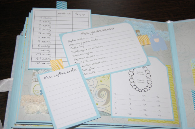 11-й разворот (страничка про достижения и успехи малыша: тег про рост и вес, тег про первые достижения, тег для записи первых слов, а ткже тег про зубки, и страничка с карманом для диска)