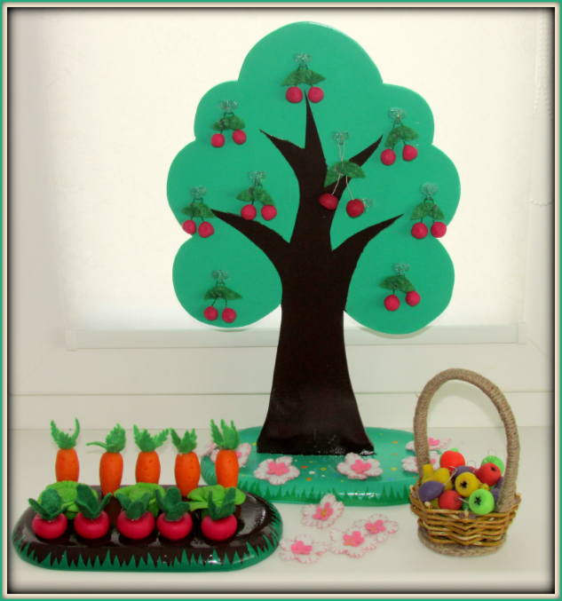 Вот такая получилась игра. Дочке очень понравилось - и сажать овощи в грядки, и собирать и развешивать фрукты..Вообщем мама с папой не зря старались))