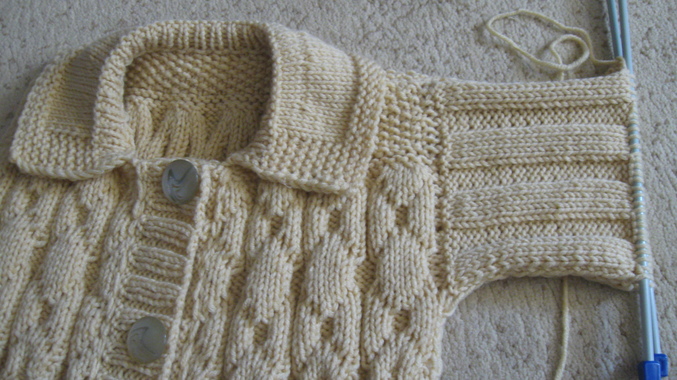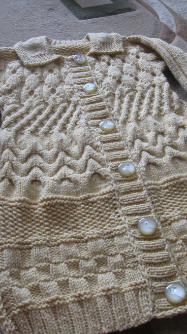 сшила полочки и спинку, набрала по краю выкота петли и провязала 2см резинкой 1х1
