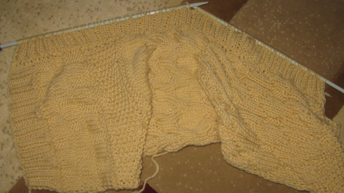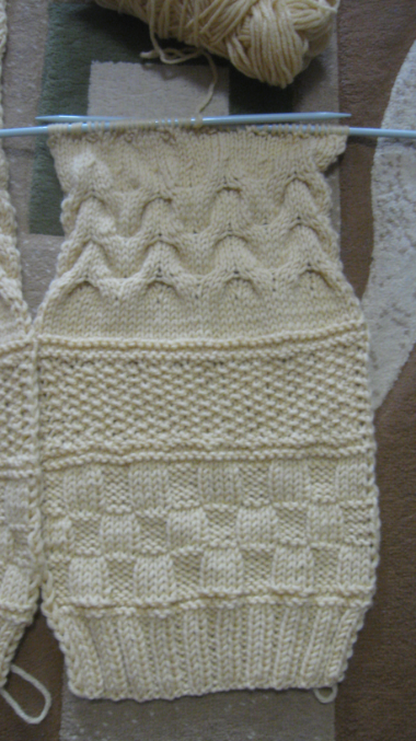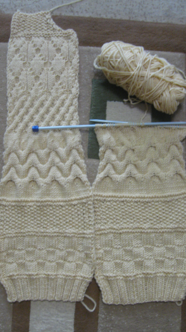 для спинки набрала 82п, резинкой 2х2 провязала 11 рядов, затем 3 ряда платочной вязкой, узором "шахмотка" 3 рапорта в высоту, 4ряда платочной вязкой, 15 рядов узором "рис", 3 ряда платочной вязкой, далее 7 рядов чулочной вязкой, в 8м изнаночном ряду делаю прибавки после каждой 5й петли 15раз. вяжу 3 раза по схеме 2, после в изнаночном ряду делаю убавки провязывая 5и6 петли вместе. затем еще 4ряда чулочной вязки и 2 рапорта по высоте плетенкой по схеме 3. далее вяжу узор "медальоны" по схеме 4 2 раза.4ряда платочной вязкой, далее узором "рис". разбила вязание на 3 части, средние петли закрыла для горловины, продолжила вязание и через 1.5см закрыла оставшиеся петли.