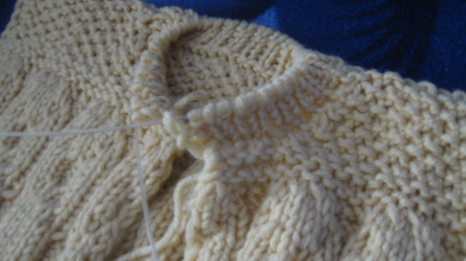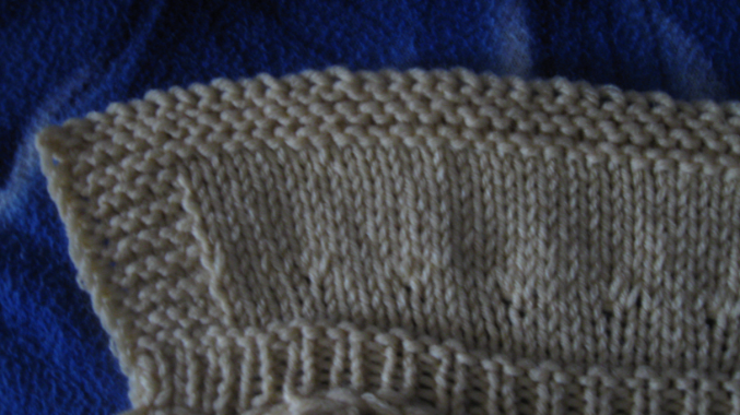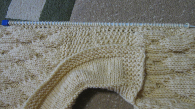 затем 2 ряда лицевыми петлями, а далее отложной воротник, первые и последние 5п платочной вязкой, в четвертом ряду лицевой глади прибавила петли, из каждой 4й две