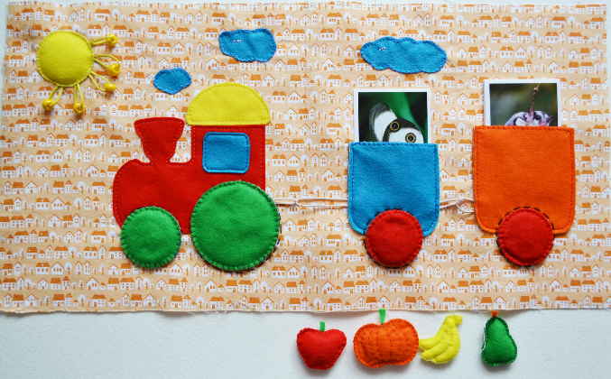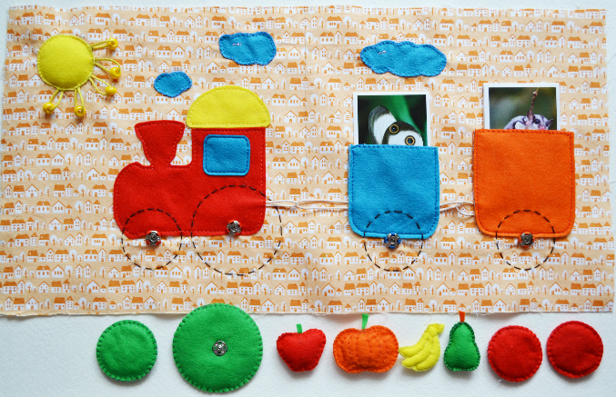 Поезд с колесиками на кнопках, они, кстати, крутятся) В вагончиках могут лежать фрукты-овощи или карточки с животными. Солнышко мягкое.