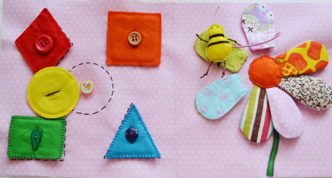 Добавилась пчелка-шуршалка на магните и геометрические фигуры разных цветов, крепятся на пуговки, подсказка - контур фигуры, вышитый на страничке.