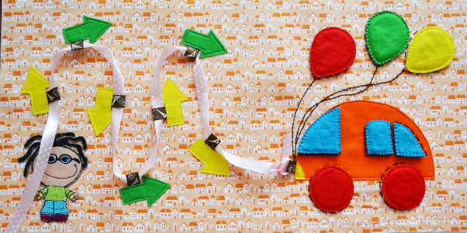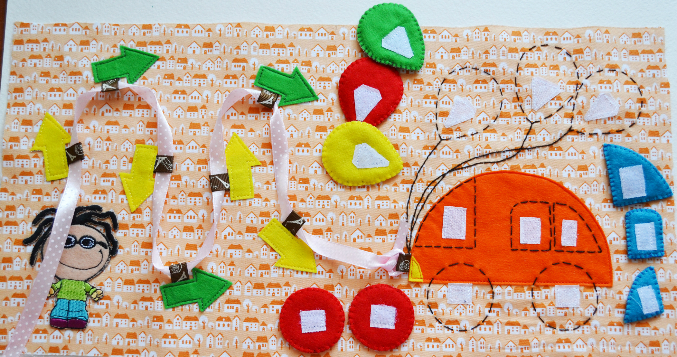 Вместо ленты на страничке будет шнурок-веревочка. Детали автобуса и шарики на липучках.