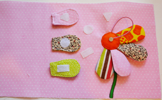 В цветочке 7 лепестков: 4 пришиты с разным наполнителем для тактильного восприятия, три лепестка интерактивны, на липучках в виде разных фигур, фигуры видно на внешней стороны лепестка (может сверху еще пришить фигуры из цветного фетра? чтоб ярче) В центре цветка спрятан магнит, сверху второй, он будет внутри пчелки, только я еще не придумала как ее сшить, в процессе.
