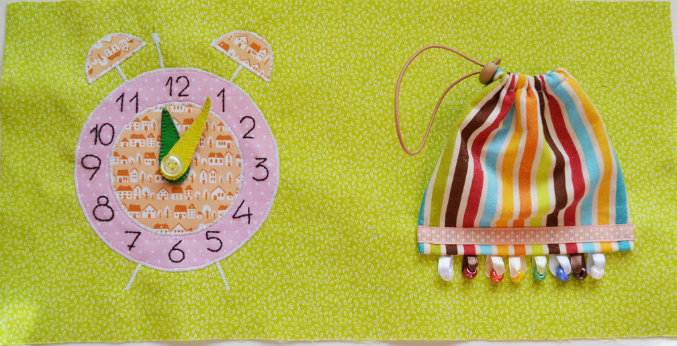 Будильник, стрелки двигаются. Мешочек на резинке, сзади липучка, чтоб держался на странице.