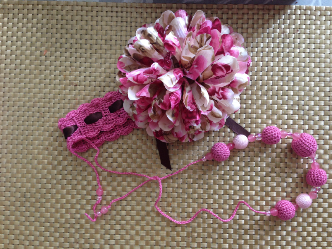 Цветочек покупной, а повязочку сама вязала. Там все просто, 8 ссн, 3ссн - 2в- 3ссн и так по длине по обхвату головы, а потом обвязала и ленточку вставила.