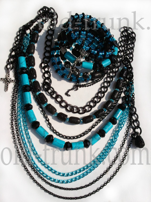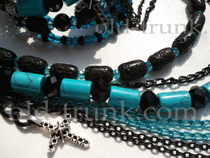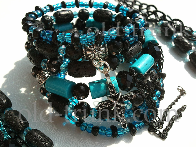 Комплект из браслета и колье с обилием цепей, из природной лавы и бирюзы, гранёного стекла.