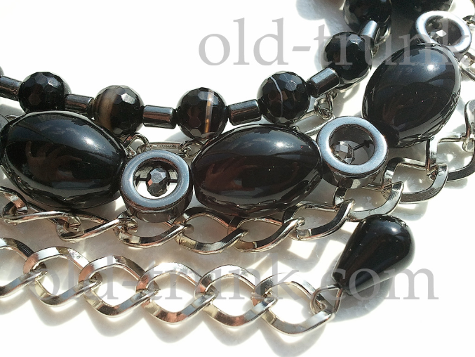 Серебристый металл, поникший цветок, чёрный агат, магический гематит, крест и обилие цепей.