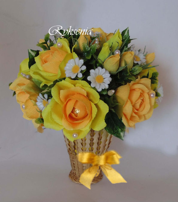 очень красиво,солнечно!А я бы на вазочку или что это,корзинка прикрепила ленточку белую пошире и на нее желтая поуже.ну как то так))))