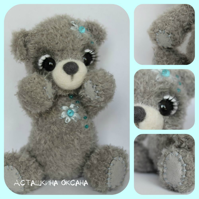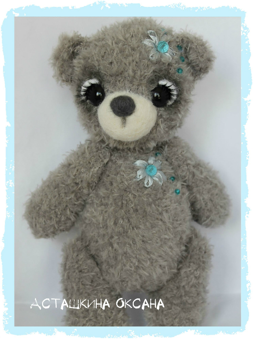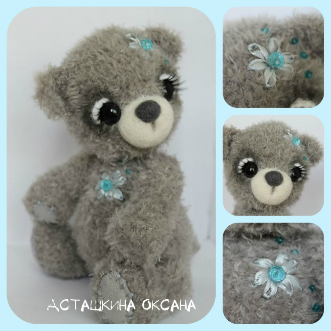 Игрушечный мир - животныеМишка Лия родилась для выставки, мишка ростом 24 см, связана из фактурной пряжи производства США, 6 шплинтов, в попке стеклянный гранулят, мордочка - сухое валяние, на лапках подушечки из замши, вышивка атласной лентой, бусины из чешского стекла.