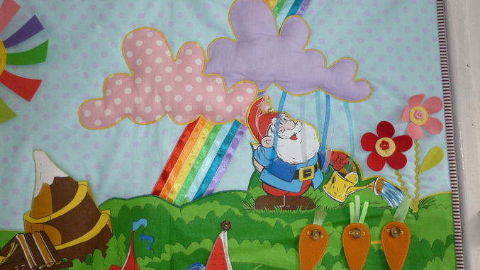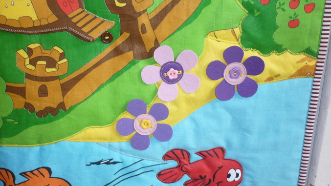 Попросили сшить коврик в сад для младшей группы, деткам 2.5- 3 года. Причем именно на застегивание пуговиц, развивать мелкую моторику. Композицию составляла из разных тканей, прослойка-синтепон, съемные детали из ткани проклеила бандо, чтобы форму держали. Размер 100 на 80 см. Съемных деталек еще прибавится, будут бабочки, птички, гномик с удочкой, моя работа выполнена- основа для фантазии готова. Ну и вот что вышло