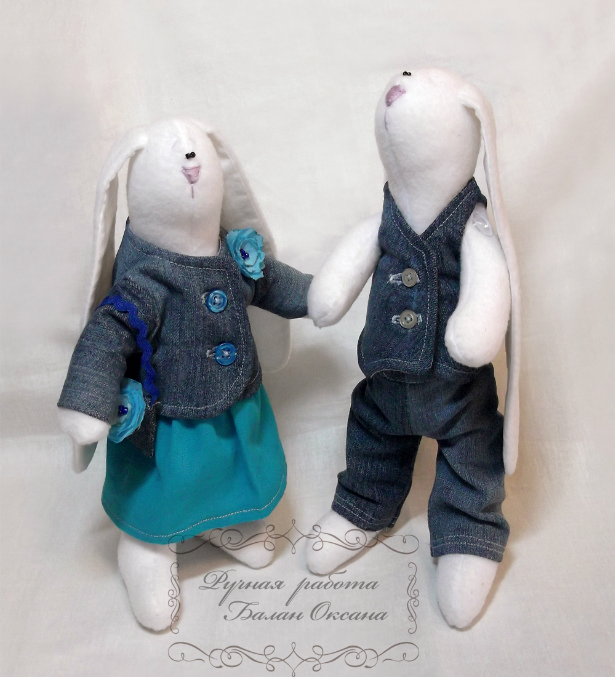 А вот и моя работа. Заики сшиты из флиса. Рост около 25 см. Имен я не давала это сделает маленькая девочка по имени Анисия. Лапки на пуговичном креплении, сидят и стоят очень хорошо. Вся одежда съемная.