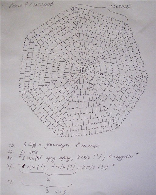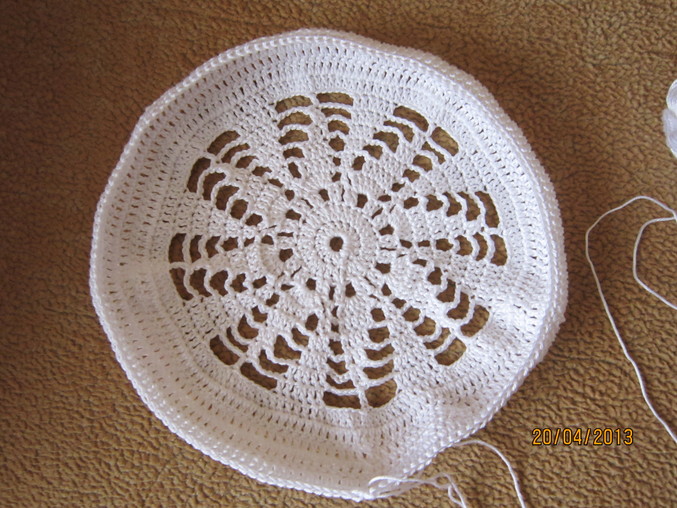 Донышко 14см.От дырочек до дырочек,потом я вязала ровным полотном без прибавлений и удавлений.