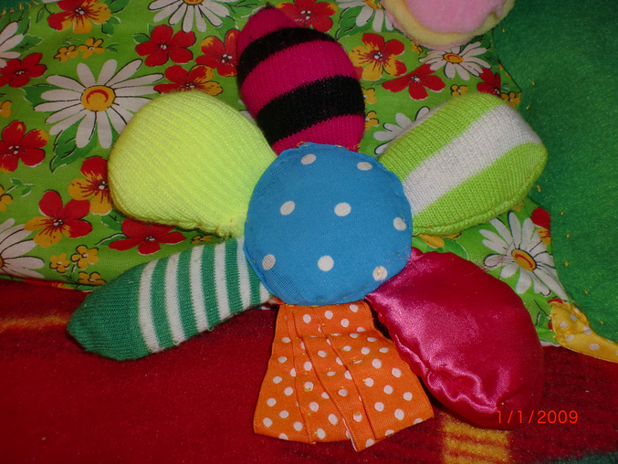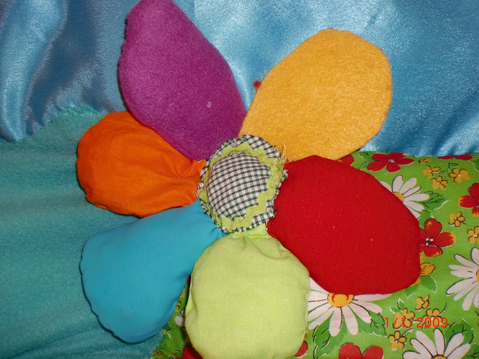У цветочков серединки звенят, лепестки все из тканей разной фактуры. Лепестки наполнены шуршалками, бусинами,бубенцами, разными крупами.