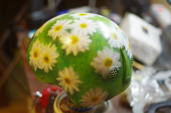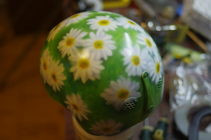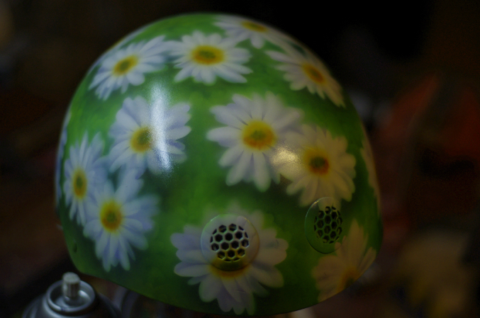 Ежик-это была первая работа, как взяла аэрограф. А потом только фрихэнд. Я в другой студии рисую, т.е. сейчас по понятным причинам перерыв, а так... А как бы делала шлем, да так же, как бы кистью или карандашом. Для цветов вовсе не обязательно трафарет, я бы сказала совсем не нужен. Трафарет - для узоров, а цветы...в них суперточность не нужна.