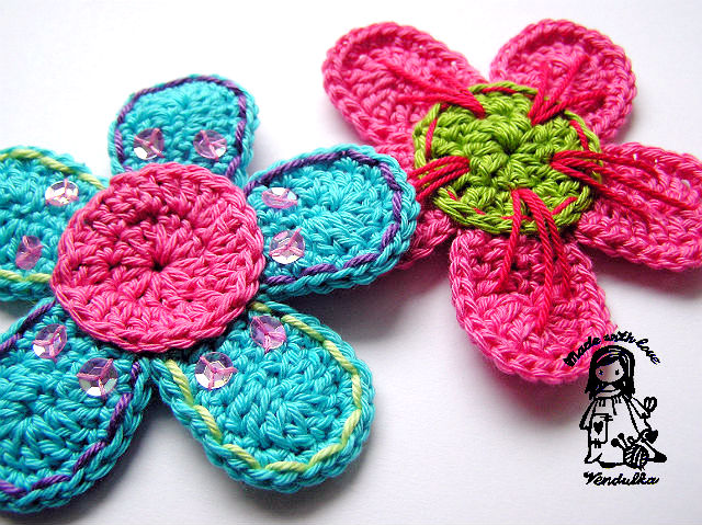 Взаля у Ирины на осинке, за что её спасибо!!!!!! А в середину вяжется круг : 1 р. - 12 ССН; 2 р. - 24 ССН. И нашивается сверху на лепестки.