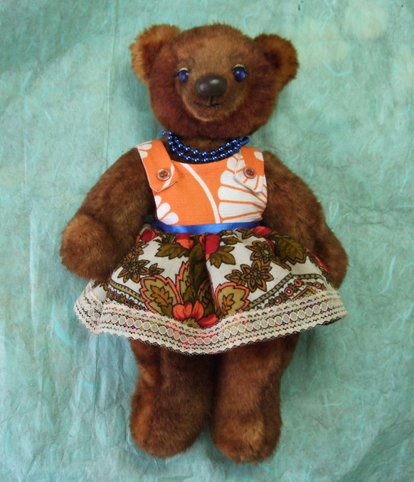 Мишка из искусственного меха, лапы на шплинтах, голова качается, мордочка тонированы масляными красками, нос вначале вышит черным ирисом, потом переделала- сверху пастой для декупажа намазала, просушила, пошкурила нулевкой, покрыла несколькими слоями акрилового лака.