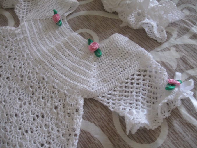 Я очень старалась....До платья я вязала пледик спицами...а обвязку-рюш крючком...опять же девочки с сообщества обьяснили как!!!