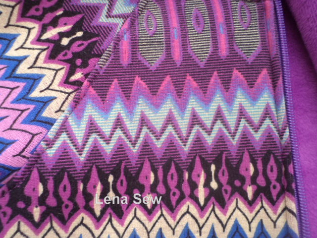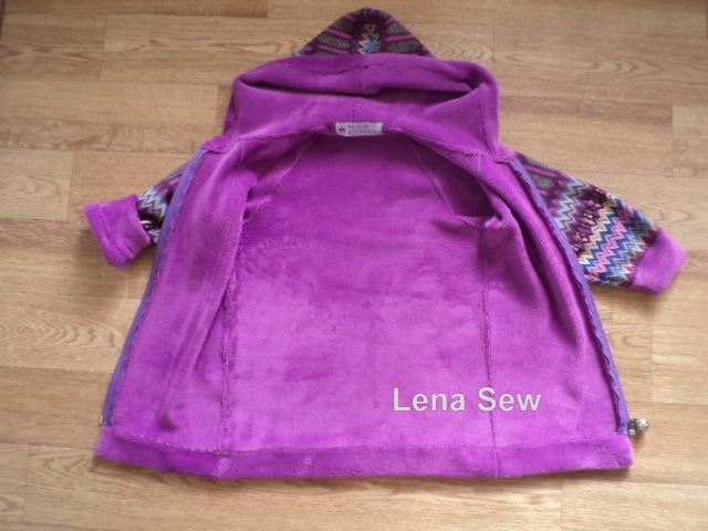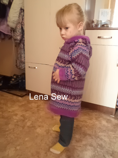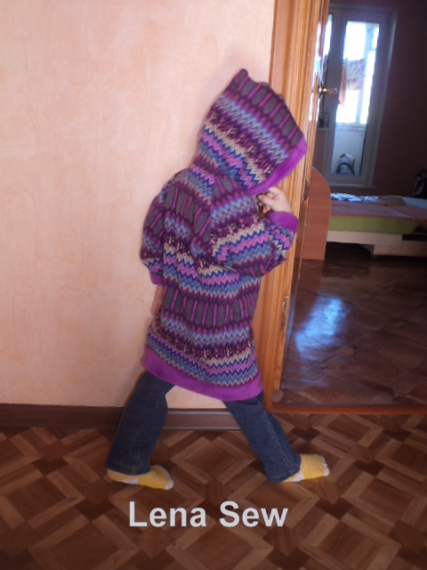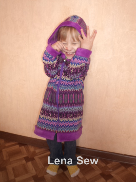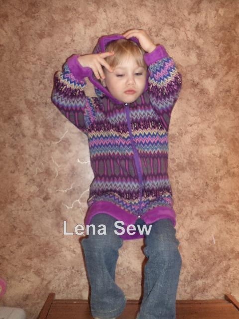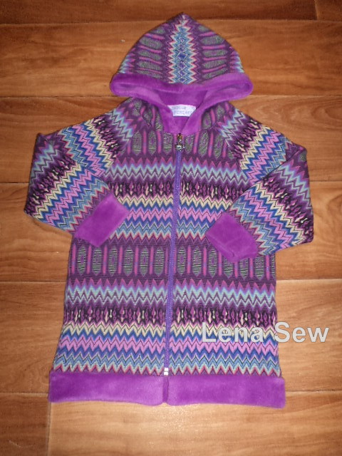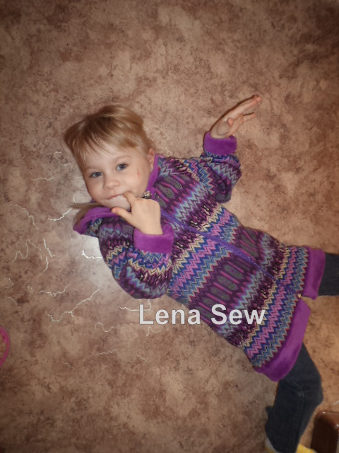 Ткань трикотаж на меху потрясающей красоты(как я жалею,что себе не взяла). Купила всего 70см для дочки-оказалось в притык),на совмещение рисунка полочек и рукавов не хватило ткани.