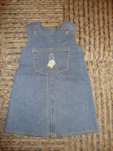 Еще добавляю сарафанчик для дочи из папиных джинсов. Сшился очень быстро.