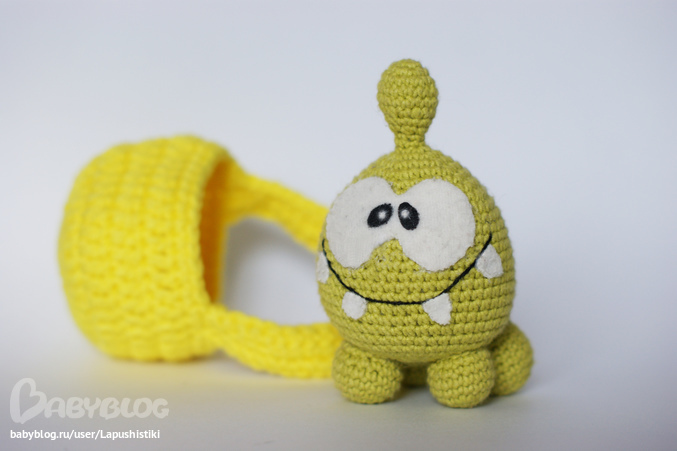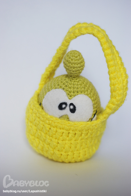 Очень милый чудик получился, тискательный))) Чуть позже сделала для него корзинку, чтобы было удобней носить с собой.
