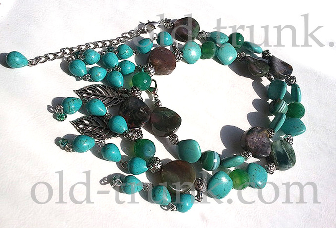 Выполнен из бусин яшмы, агата, малахита, жадеита, говлита, стекла, металла, бисера и акрила (браслет)