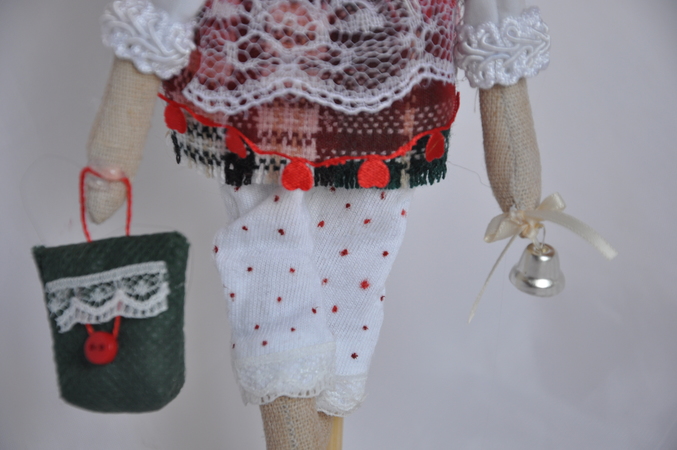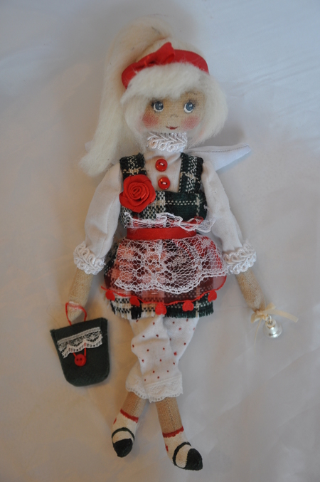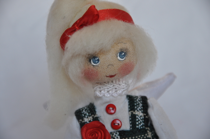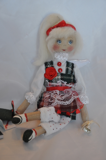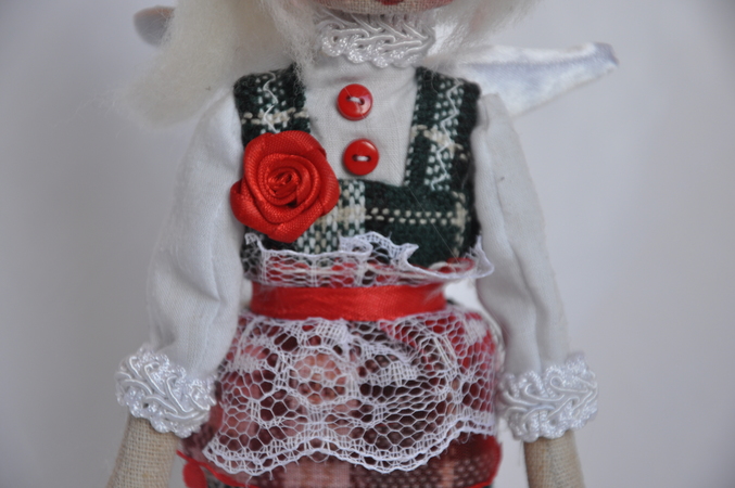 Материалы: лен тонированный, хлопок, шерсть, трикотаж хб, кружево, микропуговички, атласная розочка, атлас (крылышки), акриловые краски, румяна, фурнитура.