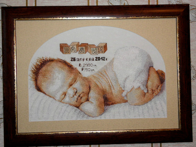 Вышила сие чудо еще беременная когда была и ждала картина своего часа) Час настал,годовасие наступает и вот он подарочек уже готов) Вышивала для сынульки своей подруги,до этого из той же серии вышивала картину для доченьки ее,вот и попросила подружка вышить компанию к первой) Оформлением осталась довольна,конечно для себя что нить посложнее по паспарту выбрала,но для подарка думаю неплохо)) Осталось только подарить малышу на память,как же приятно дарить свои творения)))))