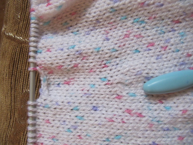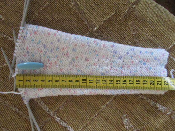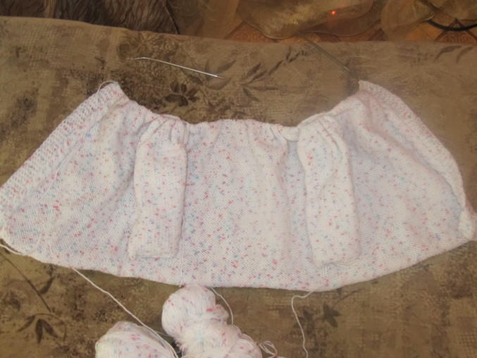 Через 27см от наборного края закрыть для пройм с обеих сторон от маркера по 3п. Петли отложить.