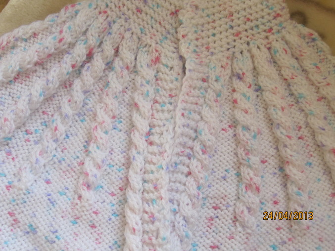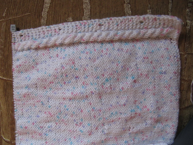 Далее вяжем так: кром., 4п. платочной вязкой (п. планки), 1п. изн. гладью, 4п. косой, * 8п. изн. гладью, 4 п. косой (при этом косу начинать в том же ряду как косы по краям) и т. д.