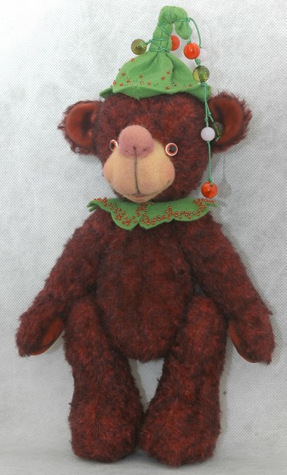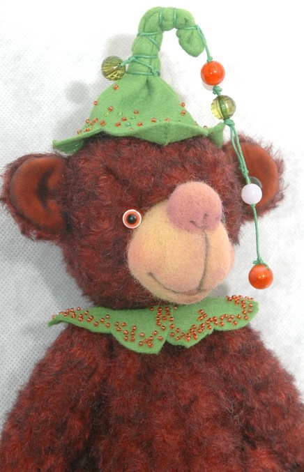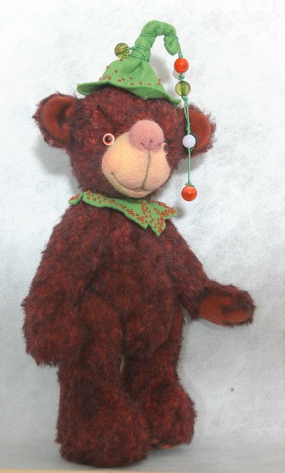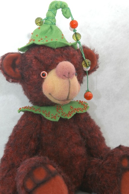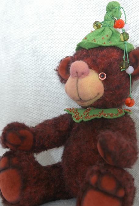 Мишка сшит из немецкого мохера, мордочка - кардочёс, глазки акриловые, наполнитель - холлофайбер и стеклянный гранулят, ладошки и стопки - миништоф, 5 шплинтов. Шапочка и воротничок из фетра, расшиты японским бисером. Тонирован масляной пастелью.