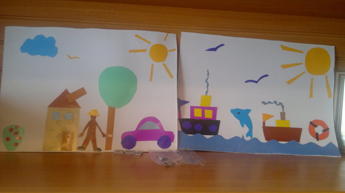 А где две аппликации - там я вырзаю, а он аккуратно клеит и приклеивает. Иногда помогаю точно приклеить... Иногда сам лепит куда хочет)
