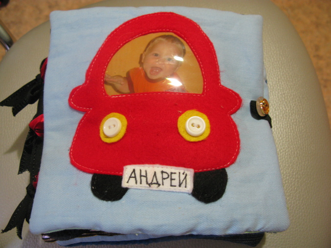 Так как у меня сынок, то обложку я решила сделать в виде машинки, а водителем стал Андрей. Фотографию накрыла куском прозрачной пластиковой папки.